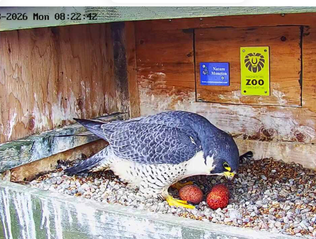 The nest cam is located in a nest box on top of the Assomption building in Downtown Moncton, New Brunswick near the Petitcodiac River. This is an ideal location because Peregrine falcons nest close to rivers, on cliff edges of 50 meters or higher, and in areas with an abundance of preferred prey.