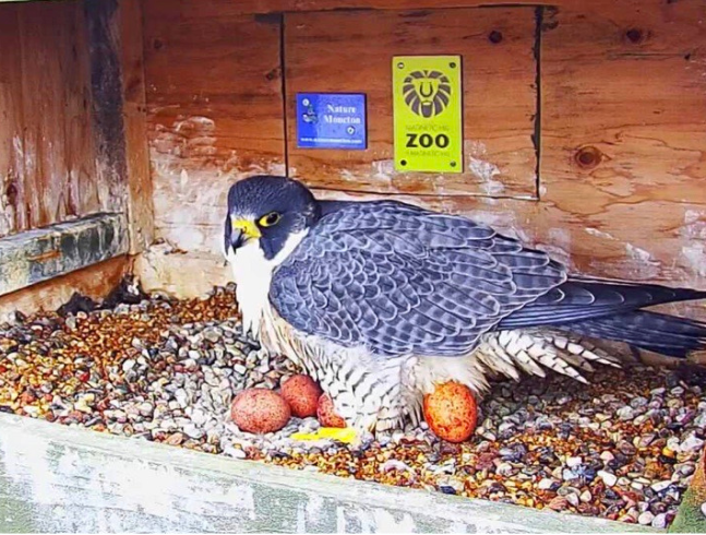 - March 27, 2024 – A peregrine pair was regularly visiting the nest box; courtship, nest maintenance, and food-sharing behaviours observed.
